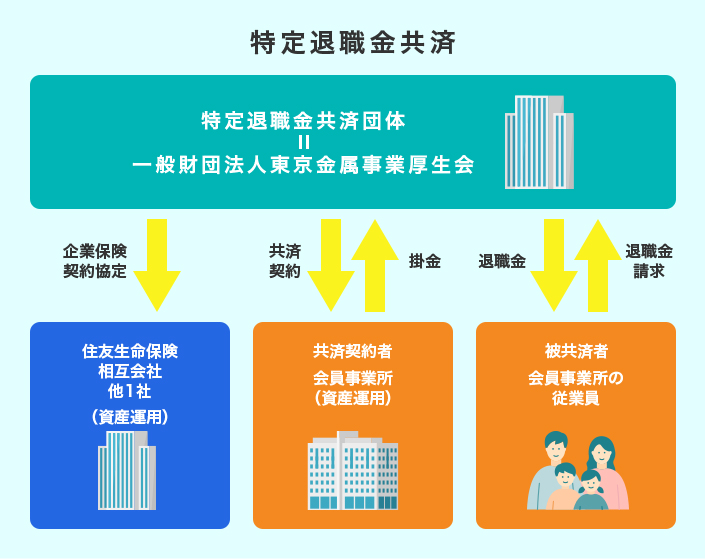 特定退職金共済制度「東京金属事業厚生会」は、金属事業業界の事業主がその従業員の退職金の外部積立のために、当厚生会と個別に退職金共済契約を締結 して「共済契約者」となり、事業所の従業員を「被共済者」として掛金を拠出し、従業員が退職したとき、その従業員の請求に 基づいて当会から直接、退職給付金または一時金を支給する業界退職金制度です。